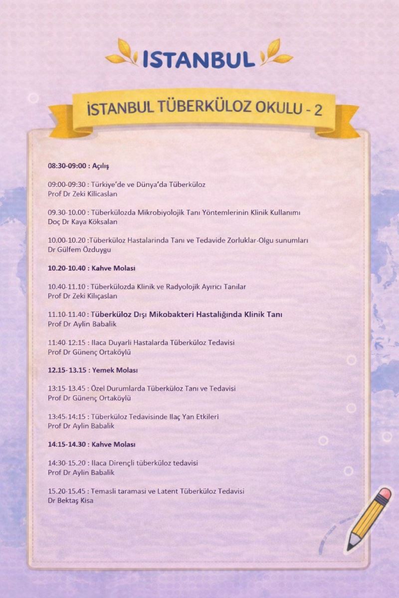 İstanbul Verem Savaşı Derneği ve İstanbul Tüberküloz Vakfı tarafından desteklenen “İstanbul Tüberküloz Okulu” kapsamındaki etkinlikler İstanbul’daki Göğüs Hastalıkları asistanlarına ve ayrıca çeşitli Tıp Fakültelerindeki intörn öğrencilere yönelik olarak İstanbul Verem Savaşı Derneği binası ve derneğe bağlı dispanserlerde devam etmektedir.